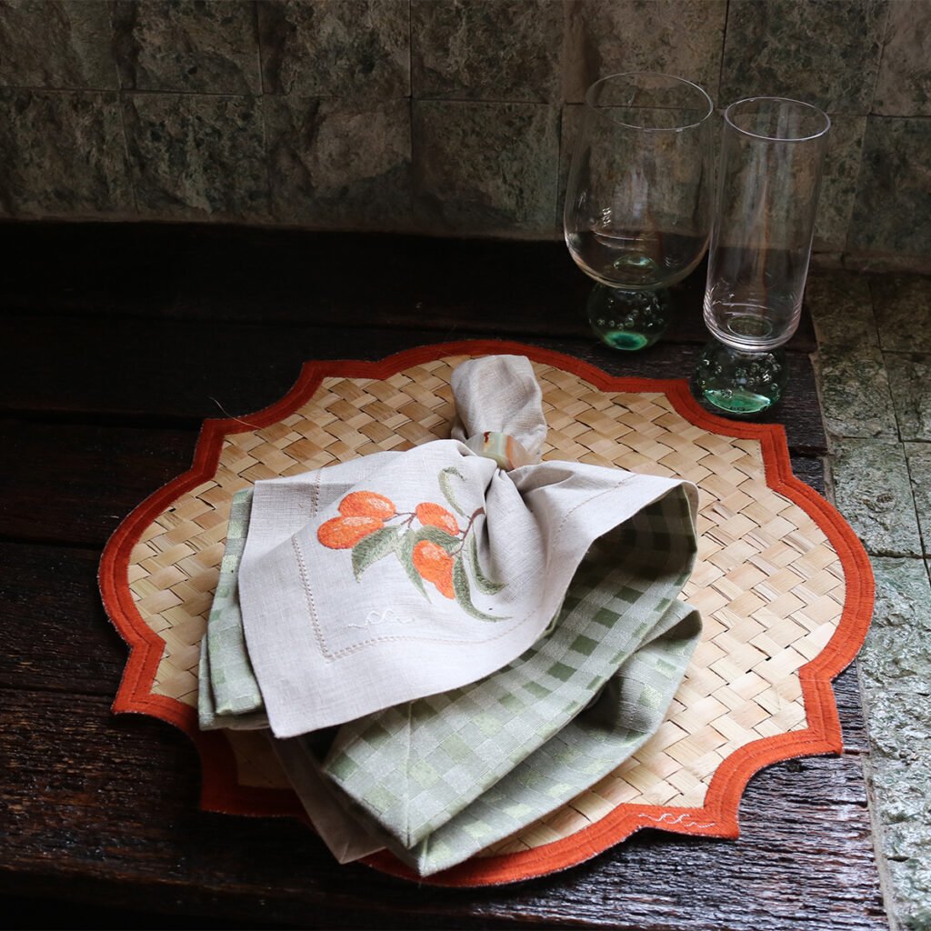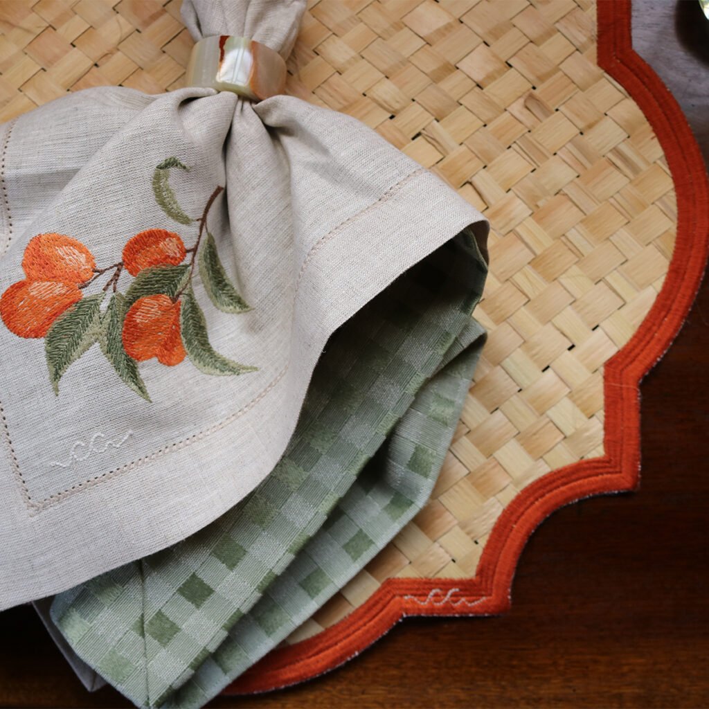 Na Coleção Kinkan, os guardanapos em linho puro ganham bordados minuciosos da laranjinha kinkan — delicados, vibrantes e cheios de vida. Os jogos americanos, trançados manualmente em palha de carnaúba por artesãos brasileiros, carregam a força da tradição e o valor do tempo dedicado a cada fibra entrelaçada. Agora, recebem também um delicado barrado bordado, desenvolvido na Casa Cabrera, que acrescenta ainda mais charme e cuidado à peça.