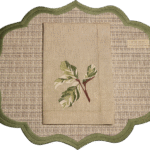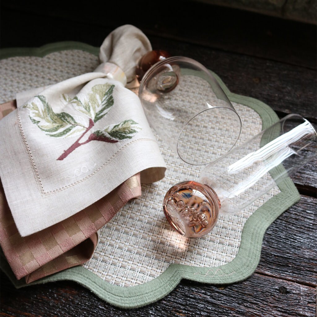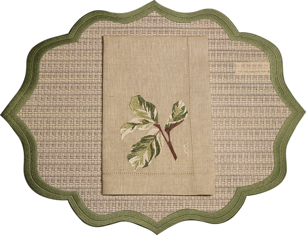 O guardanapo em linho puro recebe o bordado da folhagem com riqueza de detalhes, enquanto os jogos americanos, em rattan sintético, oferecem um toque natural com a praticidade ideal para o dia a dia.