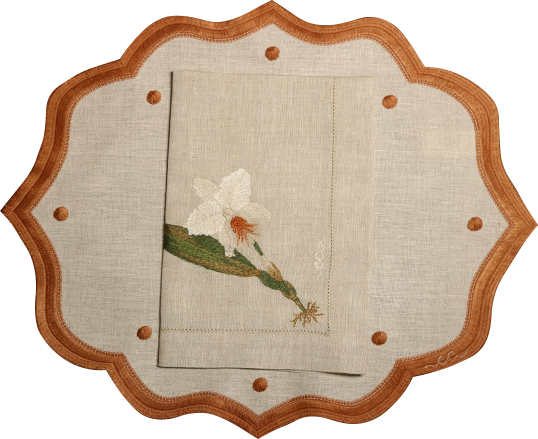 Em tons sofisticados e marcantes, os bordados ganham vida sobre o linho puro dos guardanapos e jogos americanos, revelando a beleza serena e escultural da flor. Cada detalhe celebra o encontro entre leveza e imponência, com o esmero de um trabalho cuidadosamente desenhado e programado ponto a ponto — como tudo o que nasce na Casa Cabrera.