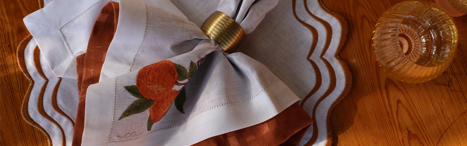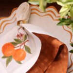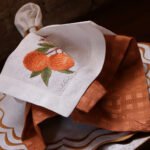 O guardanapo Bahiana é puro calor. Confeccionado em linho puro, recebe um barrado com vira de 3 cm, inteiramente trabalhado em delicado ponto ajour, que percorre toda a sua extensão. O bordado da laranja bahia salta aos olhos com suas cores vivas e o traço orgânico da fruta madura. É uma peça que combina técnica apurada com sensibilidade visual. Sofisticada na medida, sem perder a alegria que essa coleção traz à mesa.