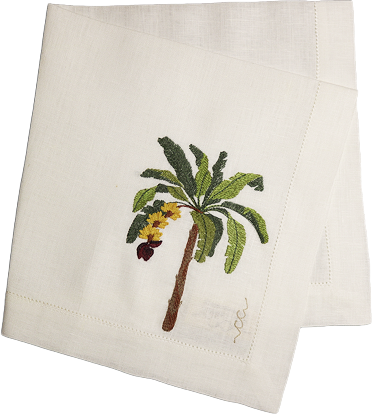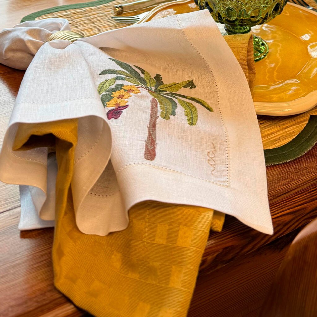 Os tons de verde, o desenho fluido das folhas e a riqueza de pontos fazem do guardanapo Bananeira uma das peças mais impressionantes da coleção. É um bordado que tem movimento, volume e textura. Um trabalho elaborado, feito para quem valoriza a força da natureza e a brasilidade traduzidas em tecido. Confeccionado em linho puro, recebe um barrado com vira de 3 cm, inteiramente trabalhado em delicado ponto ajour, que percorre toda a sua extensão.