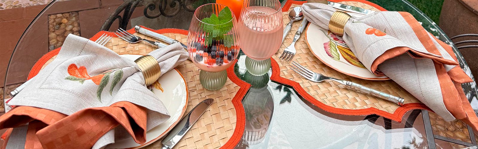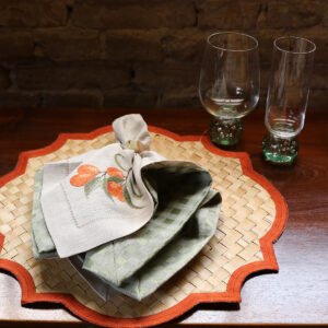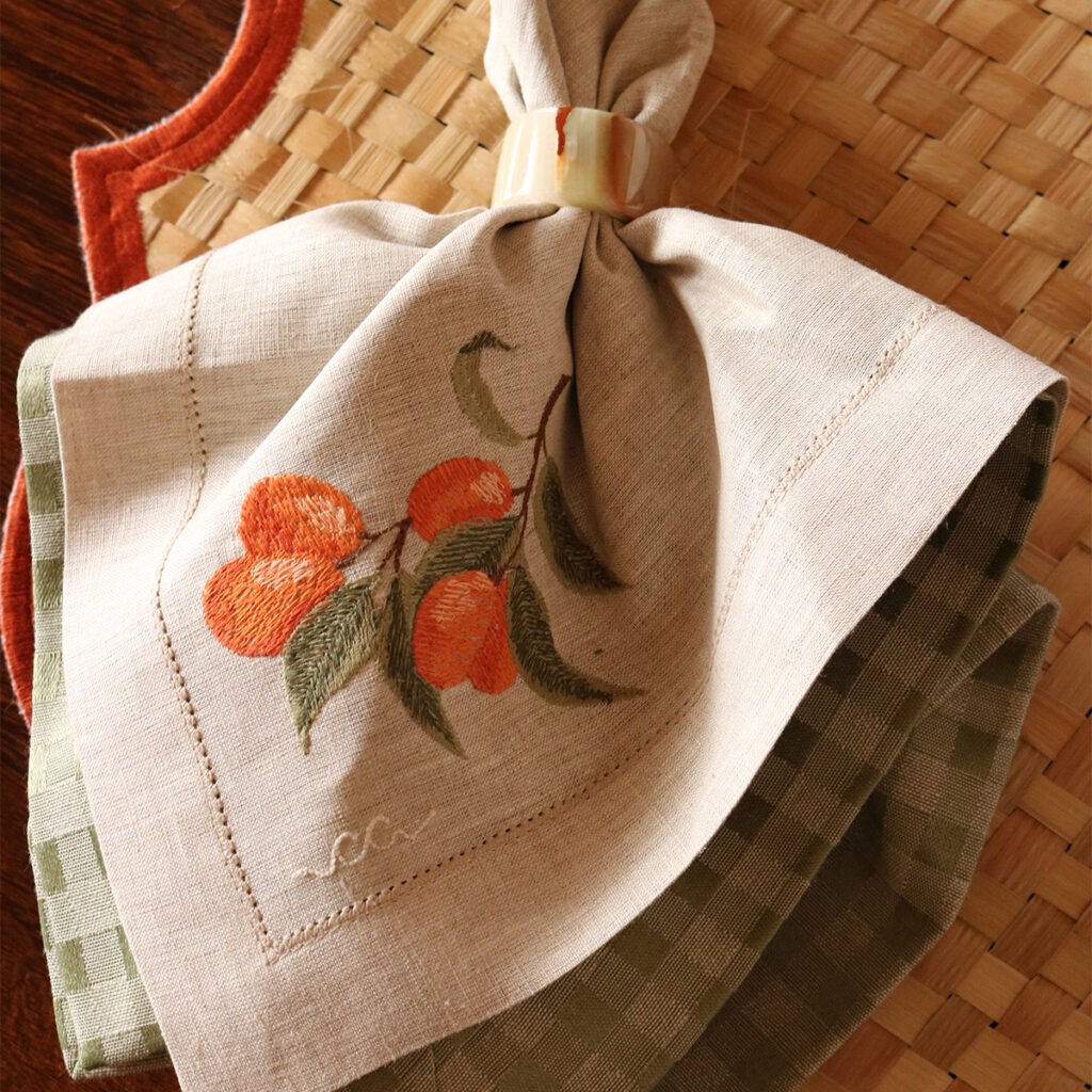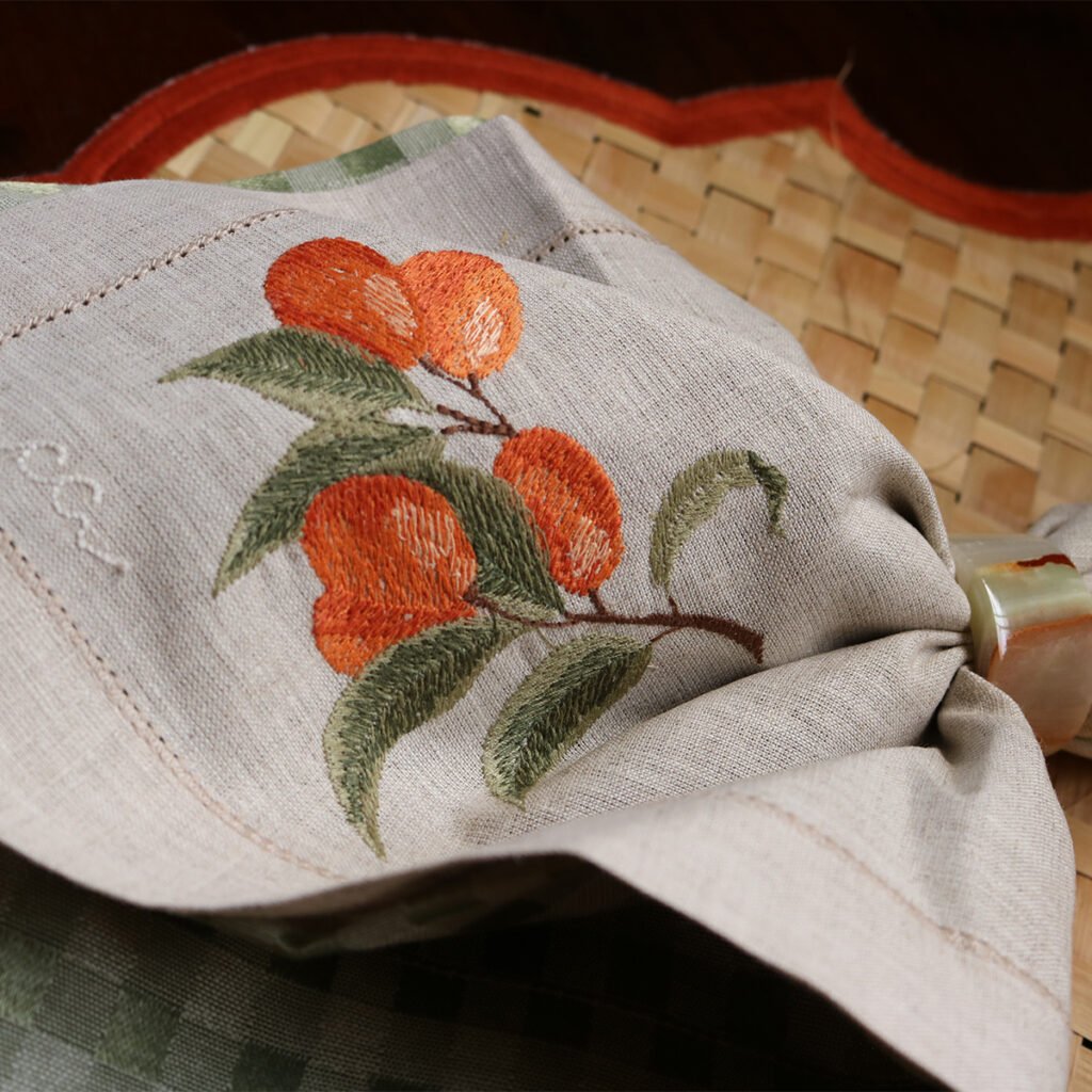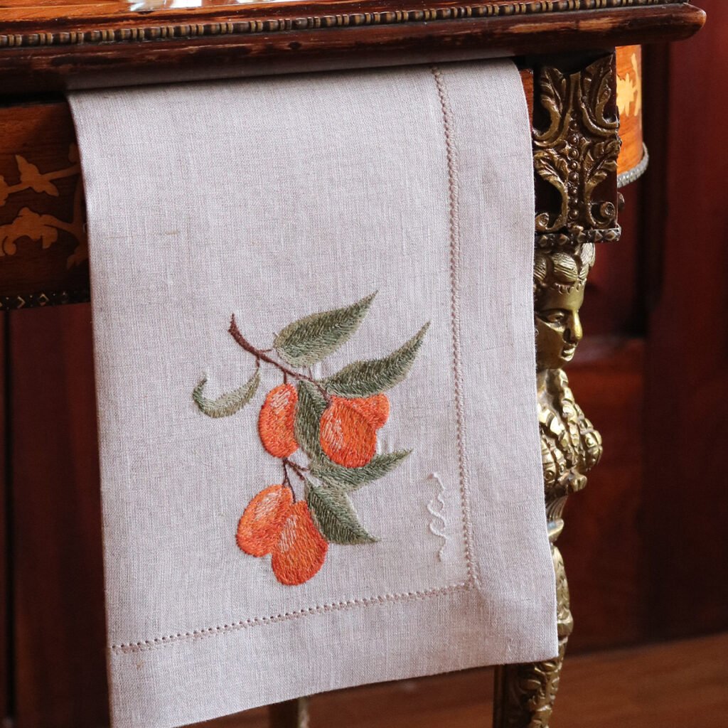 Em linho natural, traz o encanto do ponto ajour em toda sua extensão. O bordado delicado da kinkan celebra a beleza do simples, como se fosse um pedacinho do pomar à mesa. Um detalhe que acolhe e transforma cada encontro em memória.