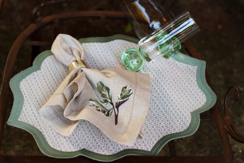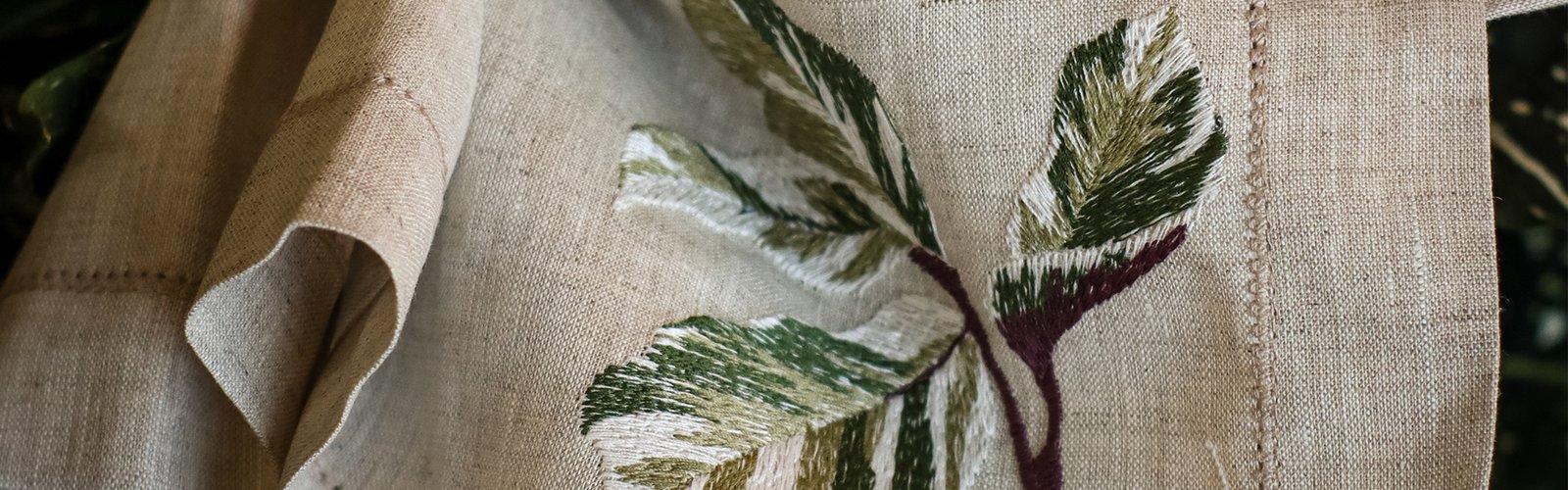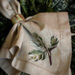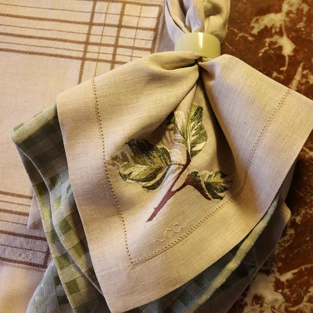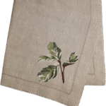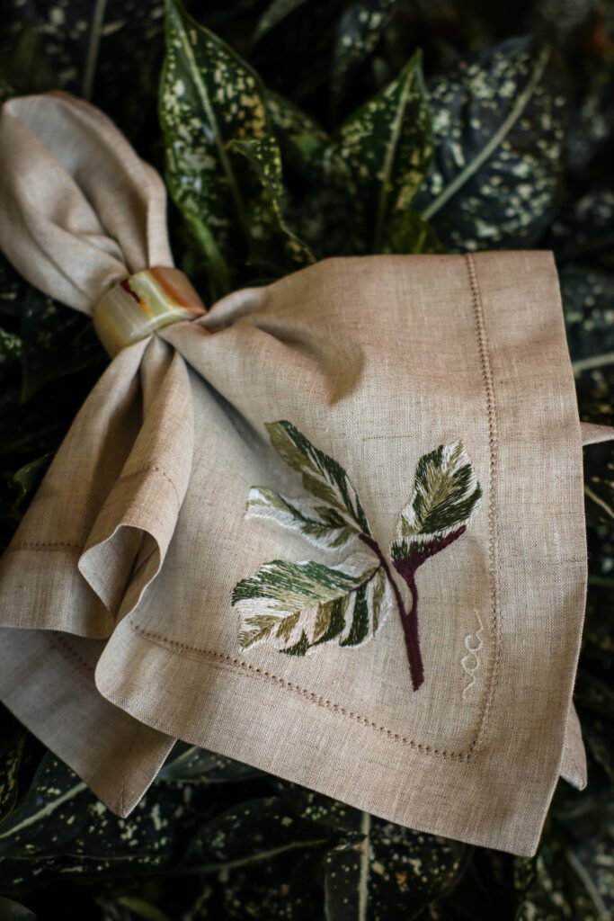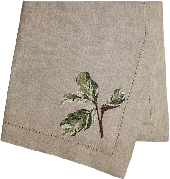 A Maranta Tricolor é uma folha complexa — e transformá-la em bordado foi um desafio que virou obra-prima. O guardanapo revela cada nuance da planta com fidelidade surpreendente. O resultado é uma peça que impressiona pela técnica e encanta pela beleza. Confeccionado em linho puro, recebe delicado ponto ajour em toda a sua extensão e um barrado com vira de 3 cm.