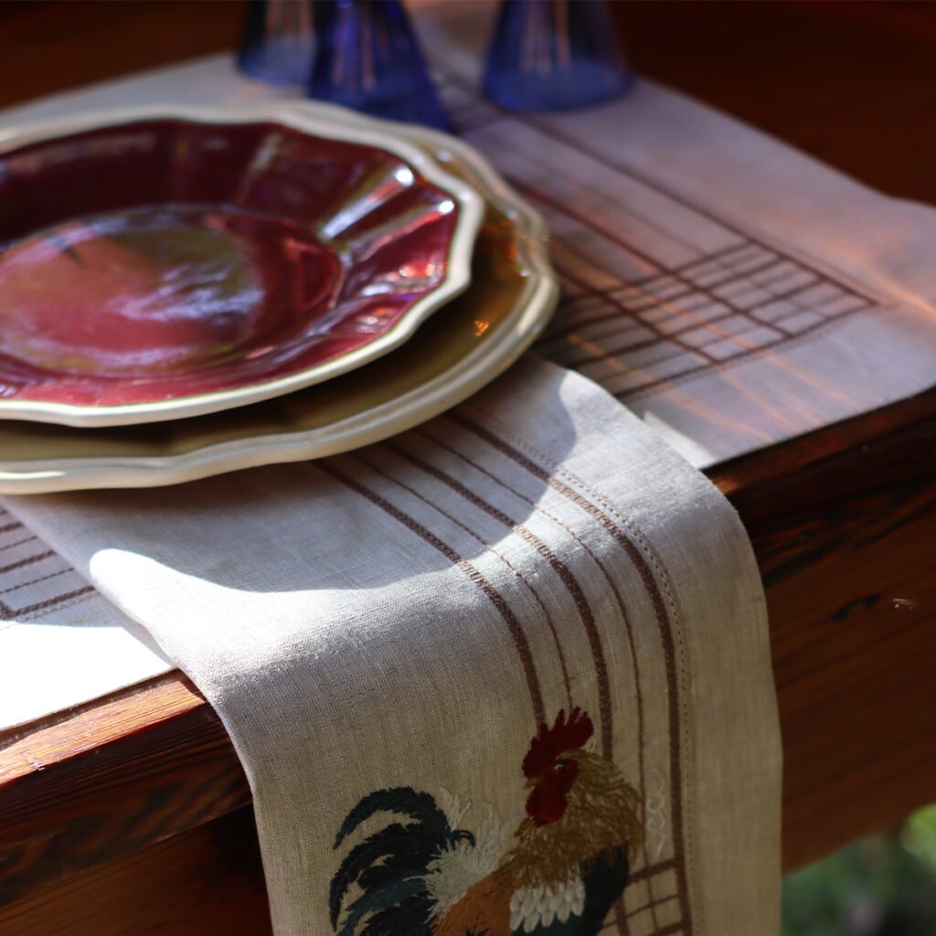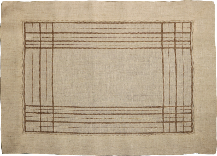 Confeccionado em linho puro, o jogo americano Galinzé é pura sofisticação sem esforço. Seu barrado largo e imponente, com 5 cm, enquadra a peça como uma moldura feita à mão, inteiramente trabalhado em delicado ponto ajour, que percorre toda a sua extensão. Nos cantos, as listras pespontadas bordadas em marrom formam um xadrez sutil, que evoca memórias de mesa posta em casa de avó — mas com a leveza do design contemporâneo.