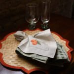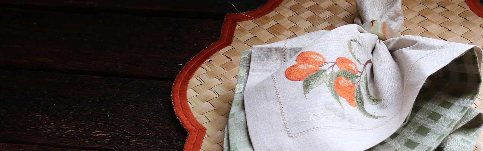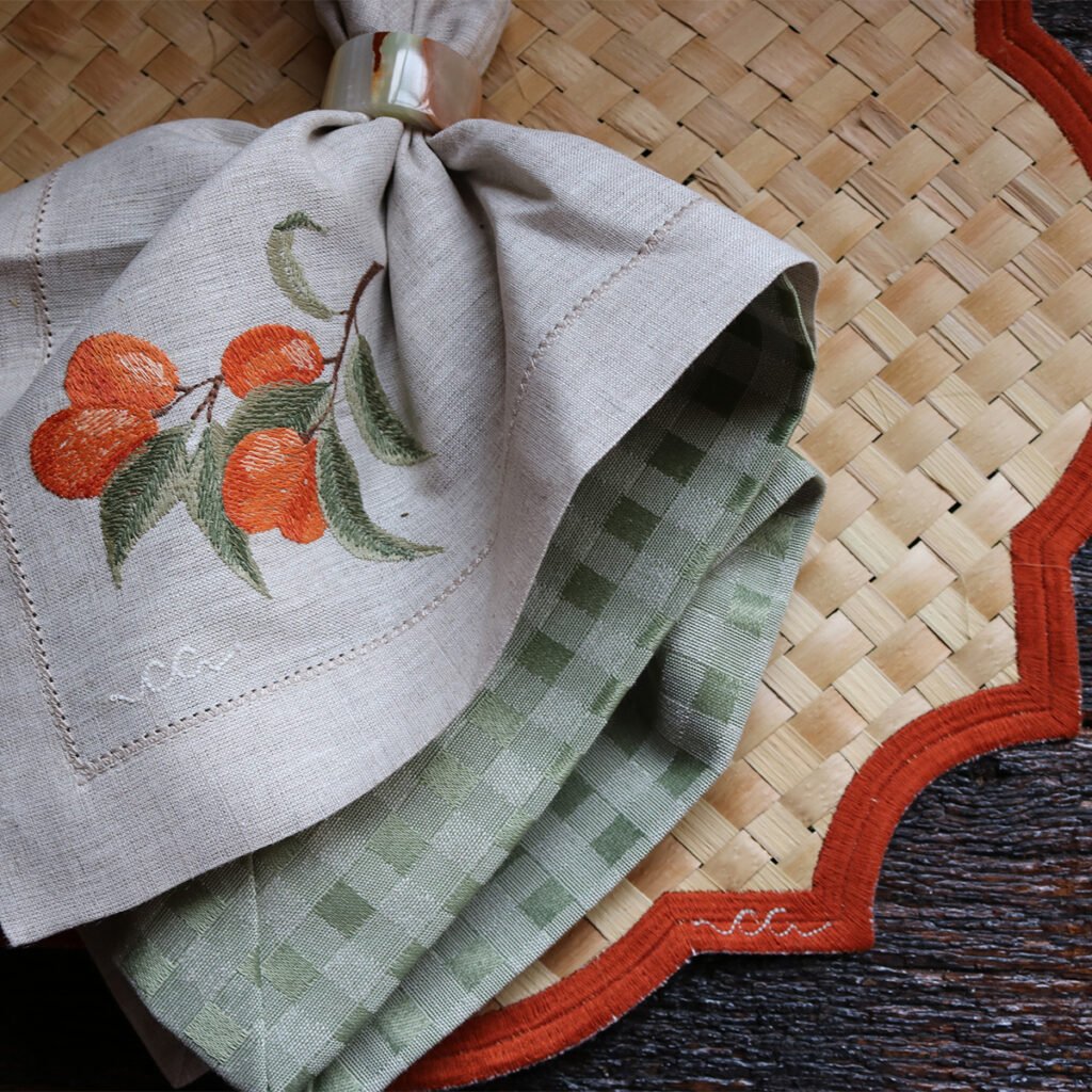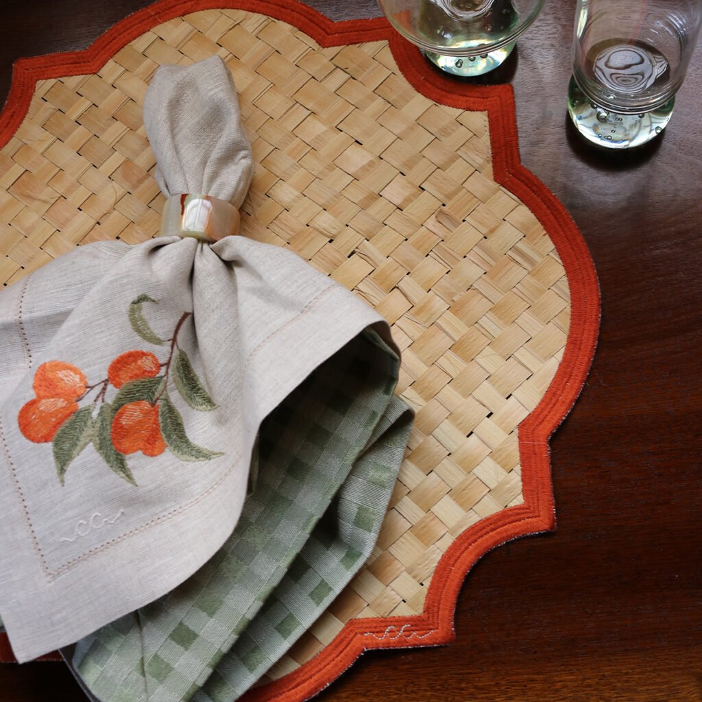 O contorno bordado em laranja evoca o frescor cítrico da kinkan e cria um contraste encantador com a palha natural — compondo uma peça cheia de textura, calor e brasilidade.