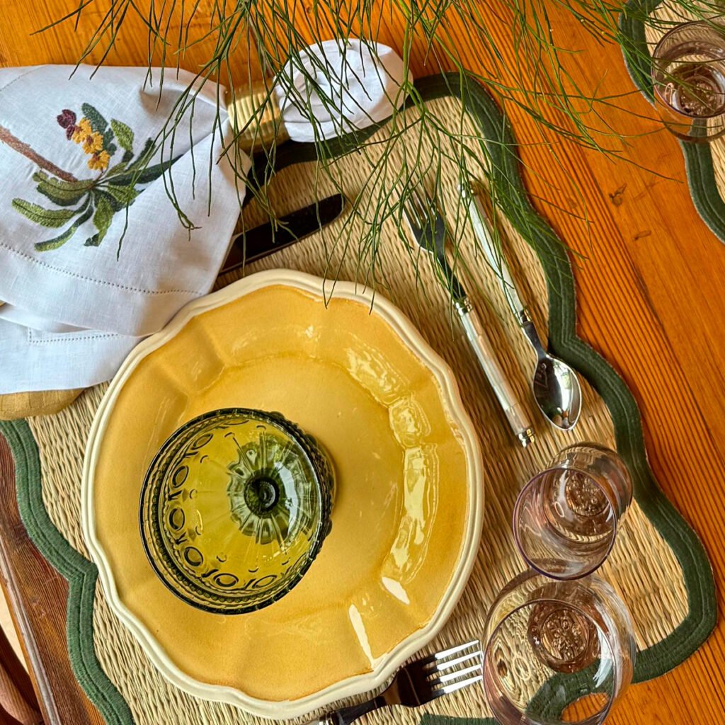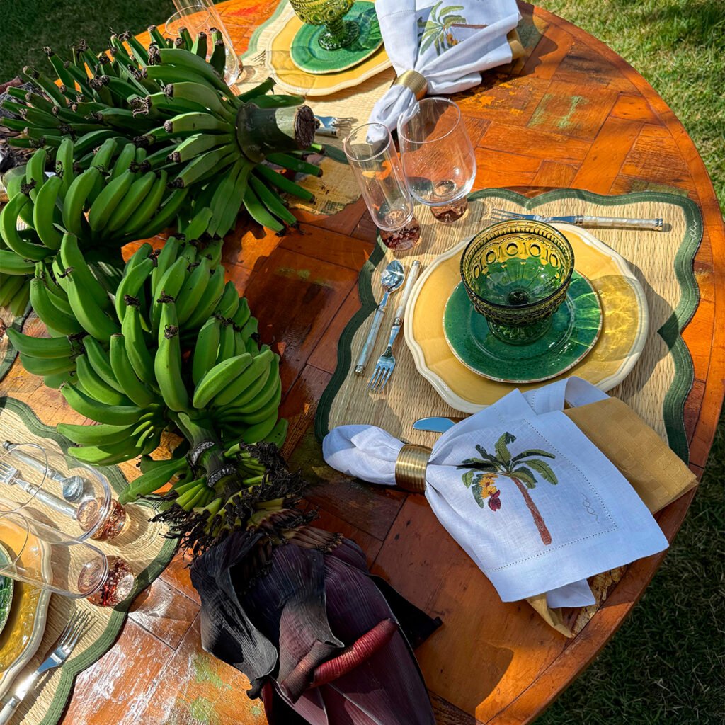 Feito em palha de junco, o jogo americano Vale Verde traz o frescor das matas tropicais para a mesa posta. Seu acabamento em verde profundo percorre as bordas onduladas como um contorno orgânico, que lembra folhas ao vento, sombras na terra, natureza em festa.