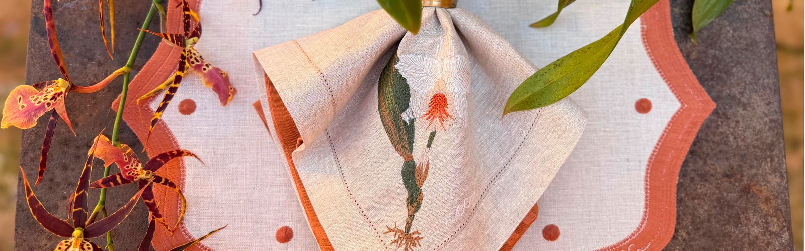 É a base perfeita para receber o bordado da orquídea Phalaenopsis, flor que simboliza elegância, leveza e presença. Um convite para desacelerar e transformar cada refeição num ritual de beleza e afeto.