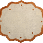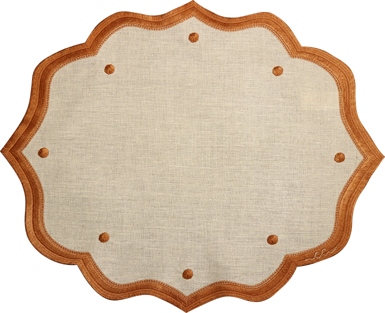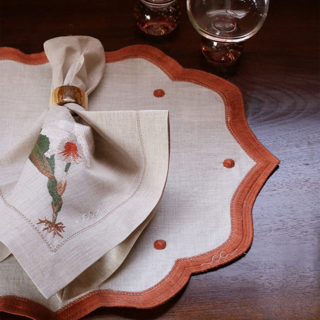 Feito em 100% linho, no tom cru da natureza, esse jogo americano abraça a mesa com textura nobre e toque suave. O barrado bordado em terracota — desenhado em curvas delicadas — traz um calor terroso e atemporal, como o fim de tarde num jardim de outono.